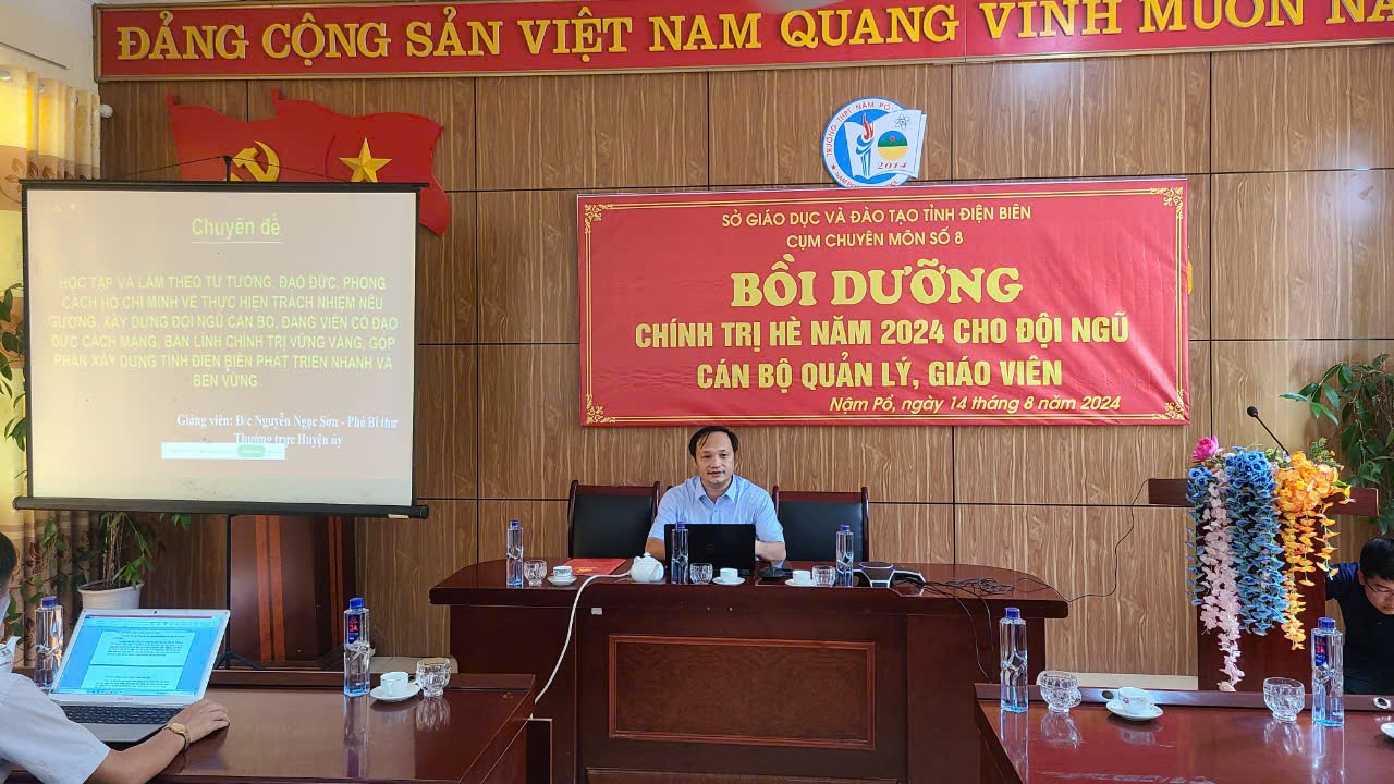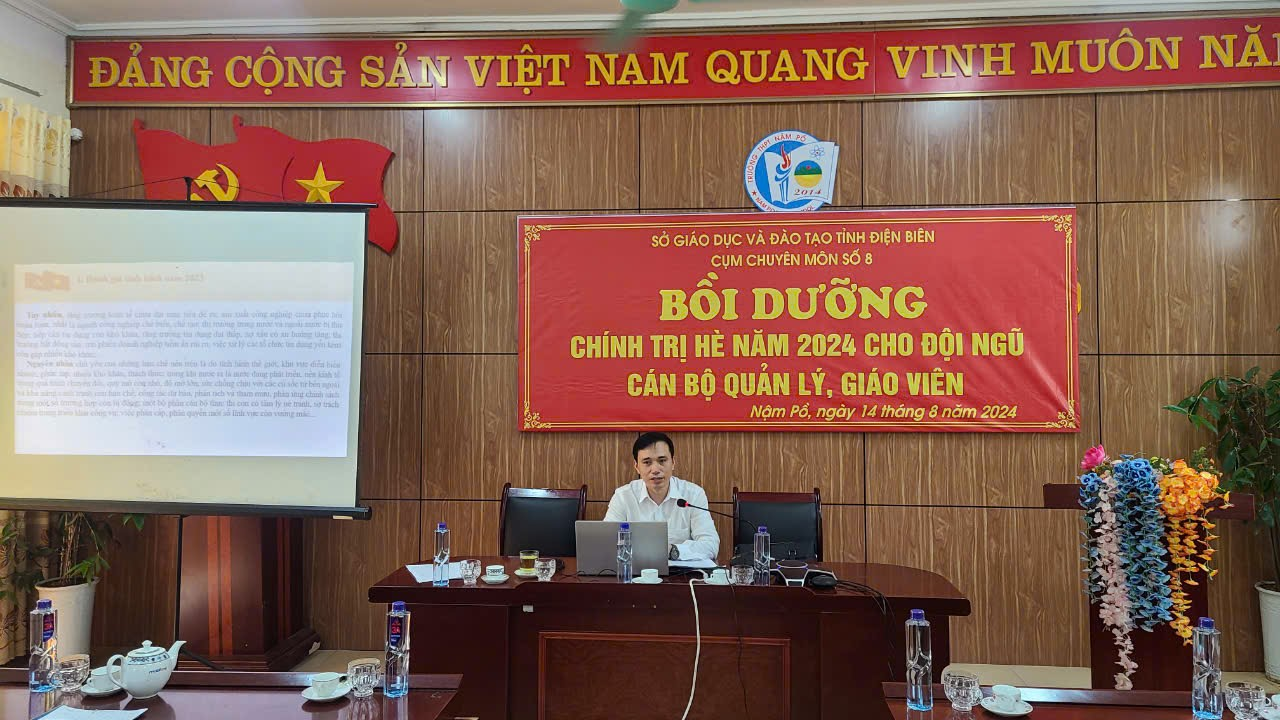 Ngày 14 – 15/08/2024 Cụm chuyên môn số 8 gồm 4 đơn vị: Trường THPT Nậm Pồ - Cụm trưởng Cụm chuyên môn số 8, trường PTDTNT THPT huyện Nậm Pồ, trường THPT Chà Cang, Trung tâm GDNN-GDTX huyện Nậm Pồ đã tổ chức lớp Bồi dưỡng chính trị cho đội ngũ cán bộ quản lý, giáo viên đầu năm học 2024-2025 với hình thức trực tiếp kết hợp trực tuyến. Đội ngũ cán bộ quản lý, giáo viên tham gia bồi dưỡng chính trị hènăm 2024 Đội ngũ cán bộ quản lý, giáo viên tham gia bồi dưỡng chính trị hè tại điểm cầu Trường THPT Chà Cang Chiều ngày 14/08/2024, Đồng chí Nguyễn Ngọc Sơn – Phó bí thư thường trực Huyện ủycho biết, bồi dưỡng chính trị hè là chương trình định kỳ hằng năm nhằm nâng cao nhận thức về chính trị, tư tưởng, nâng cao trình độ lý luận và bản lĩnh chính trị cho đội ngũ cán bộ, giáo viên trước thềm năm học mới. Đồng chí Nguyễn Ngọc Sơn – Phó Bí thư thường trực Huyện ủy chủ trì, trao đổi, chia sẻ trongđợt bồi dưỡng Bồi dưỡng chính trị đầu năm học 2024-2025 là một đợt sinh hoạt chính trị trong toàn ngành Giáo dục và Đào tạo nói chung, có ý nghĩa quan trọng và mang tính thiết thực trong việc nâng cao nhận thức chính trị cho đội ngũ cán bộ quản lý, giáo viên các đơn vị trường trong tình hình mới; đồng thời, tạo chuyển biến tích cực về nhận thức, trách nhiệm của đội ngũ cán bộ quản lý, đảng viên, giáo viên trong việc thực hiện nhiệm vụ xây dựng và phát triển nền giáo dục Việt Nam nói chung và huyện Nậm Pồ nói riêng, góp phần nâng cao ý thức trách nhiệm, bản lĩnh, niềm tin và chuẩn mực đạo đức nhà giáo để thực hiện tốt sự nghiệp Giáo dục và Đào tạo. Sáng ngày 15/08/2024, Đồng chí Lò Văn Kiên – Ủy viênBan thường vụ Huyện ủy, Trưởng ban Tuyên giáo Huyện ủy, Giám đốc Trung tâm bồi dưỡng chính trị huyện Nậm Pồ đã trao đổi bồi dưỡng cho các cán bộ quản lí, giáo viên trong cụm chuyên môn số 8 với 5 chuyên đề xuyên suốt về các nội dung cốt lõi, những điểm mới trong các văn kiện Hội nghị lần thứ 8, 9 của Ban Chấp hành Trung ương Đảng khóa XIII, tình hình kinh tế - văn hóa – xã hộitrên địa bàn huyện Nậm Pồ nói riêng và tỉnh Điện Biên nói chung. Đồng chí Lò Văn Kiên – UV BTV Huyện ủy, Trưởng ban Tuyên giáo huyện Ủy, giám đốc Trung tâm bồi dưỡng chính trị huyện Nậm Pồ trao đổi, chia sẻ trong buổi bồi dưỡng Trong hai buổi tập huấn bồi dưỡng chính trị hè năm 2024 cho đội ngũ cán bộ quản lí, giáo viên trong Cụm chuyên môn số 8 gồm 4 đơn vị trường THPT Nậm Pồ, PTDTNT THPT huyện Nậm Pồ, THPT Chà Cang, Trung tâm GDTX-GDNN huyện Nậm Pồ đã giúp đội ngũ CBQL, giáo viên nắm vững những nội dung cơ bản, những điểm mới trong các văn kiện Hội nghị lần thứ tám; Hội nghị lần thứ chín Ban Chấp hành Trung ương Đảng khóa XIII theo hướng dẫn của Ban Tuyện giáo Trung ương về việc nghiên cứu, học tập, quán triệt, tuyên truyền và triển khai thực hiện Nghị quyết của Ban chấp hành Trung ương Đảng khóa XIII; những kết quả đạt được của 40 năm đổi mới, nhất là trong công tác xây dựng đảng về chính trị, tư tưởng, đạo đức. Dự báo tình hình thể giới, khu vực, đất nước, những vấn đề mới trong đời sống chính trị - kinh tế - xã hội tác động đến công tác giảng dạy lý luận chính trị, công tác tư tưởng của thế hệ trẻ hiện nay.Giúp giáo viên cập nhật kiến thức về chính trị, kinh tế - xã hội, quốc phòng - an ninh, bồi dưỡng phẩm chất chính trị, đạo đức nghề nghiệp, phát triển năng lực dạy học, năng lực giáo dục và những năng lực khác theo chuẩn nghề nghiệp giáo viên, yêu cầu nhiệm vụ năm học, cấp học, yêu cầu giáo dục địa phương, yêu cầu đổi mới và nâng cao chất lượng giáo dục.