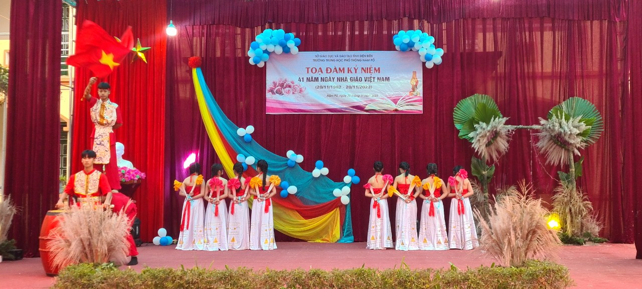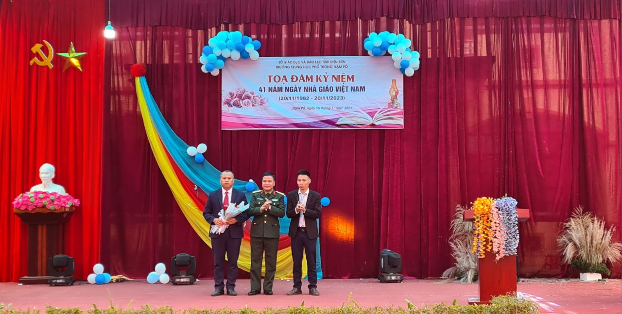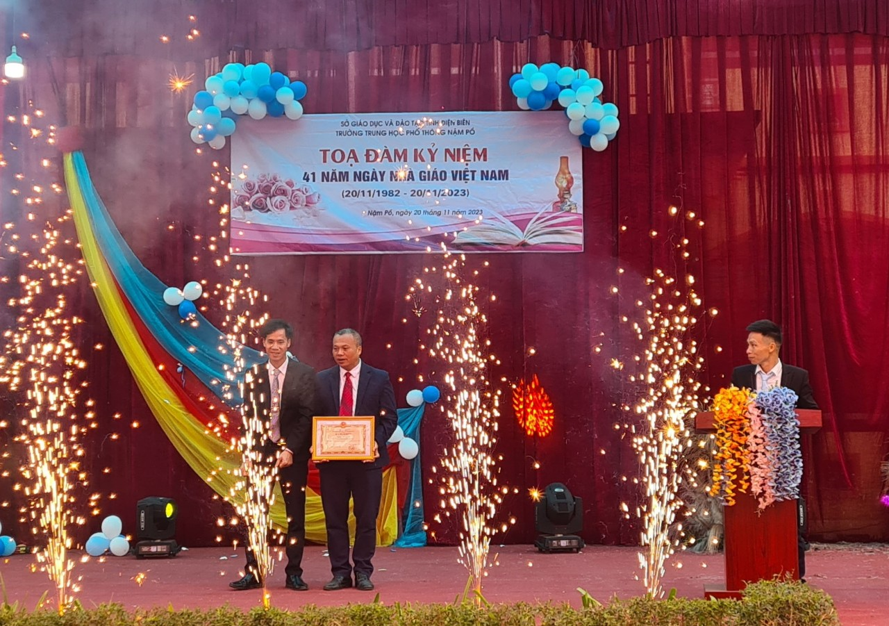 Cũng tại buổi lễ, nhà trường THPT Nậm Pồ cũng rất vinh dự được nhận Bằng khen của Chủ tịch UBND tỉnh Điện Biên với thành tích là "Tập thể lao động xuất sắc". Đồng thời để ghi nhận, khích lệ, động viên những đóng góp phấn đấu của cán bộ giáo viên và học sinh trong Nhà trường, Hội đồng thi đua khen thưởng Nhà trường đã khen tặng các thầy giáo, cô giáo là giáo viên chủ nhiệm xuất sắc trong đợt thi đua lần 1; khen thưởng cho các thầy cô giáo có thành tích cao trong công tác chuyên môn; khen tặng các tập thể lớp có thành tích xuất sắc trong đợt thi đua bao gồm 03 tập thể: 12C1, 11B1, 11B6 . Buổilễ kỉ niệm 41 năm ngày nhà giáo Việt Nam (20/11/1982 - 20/11/2023)của Trường THPT Nậm Pồ đã khép lại trong không khí vui tươi, đầm ấm. Vinh dự và tự hào, mỗi nhà giáo, cán bộ, nhân viên của Nhà trường sẽ luôn cố gắng nỗ lực để góp phần xây dựng Nhà trường trở thành một tập thể vững mạnh, sẵn sàng đáp ứng những yêu cầu ngày càng cao của xã hội./. Một số hình ảnh tiêu biểu của buổi Lễ kỷ niệm: Tập thể Hội đồng sư phạm nhà trường và khách mời. Đón nhận Bằng khen của UBND tỉnh Điện Biên Nhận hoa chúc mừng từ các đơn vị trên địa bàn Các tiết mục văn nghệ từ các em học sinh trong nhà trường