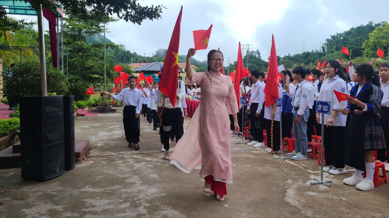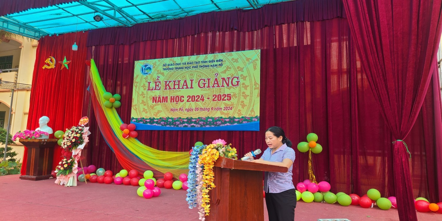 Các tiết mục văn nghệ của các em học sinh trường THPT Nậm Pồ Trong không khí cờ hoa rực rỡ giáo viên và học sinh nhà trường được nghe đồng chí Lầu Thị Liên - Chủ tịch Hội liên hiệp Phụ nữ huyện Nậm Pồ, đọc thư của đồng chí Tô Lâm - Tổng Bí thư Ban chấp hành Trung ương Đảng, Chủ tịch nước CHXHCN Việt Nam gửi các cháu học sinh, các thầy giáo, cô giáo trên mọi miền tổ quốc trong niềm tự hào, xúc động. Đồng chí Lầu Thị Liên – Chủ tịch HLHPN huyện Nậm Pồ đọc thư của Chủ tịch nước. Sau bài diễn văn khai giảng, từng hồi trống khai trường được vang lên của thầy giáo Trần Trường Thiện - Bí thư Chi bộ, Hiệu trưởng nhà trường là tiếng vỗ tay vang dậy thể hiện khí thế quyết tâm của toàn thể thầy và trò trước thềm năm học mới.