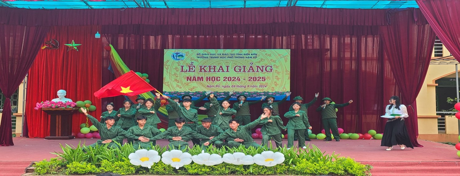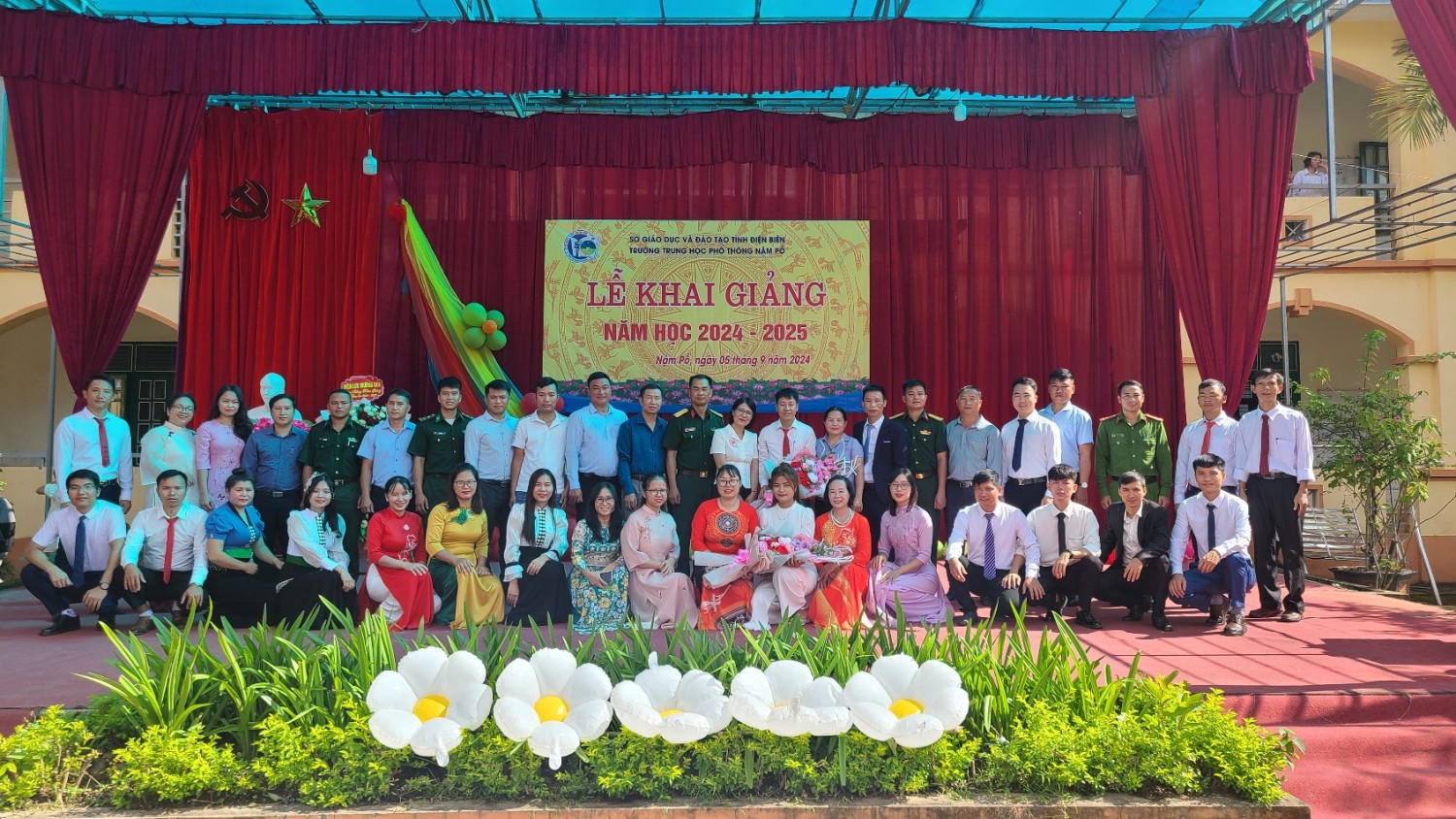Trong Lễ khai giảng năm học mới nhà trường vinh dự được đón đồng chí Lầu Thị Liên - Chủ tịch Hội liên hiệp Phụ nữ huyện Nậm Pồ, đại diện cho các cấp lãnh đạo Huyện uỷ, HĐND, UBND huyện Nậm Pồ, đại diện lãnh đạo UBND các xã Nậm Chua, Nà Hỳ, Phìn Hồ... lãnh đạo các cơ quan, đơn vị đứng chân trên địa bàn huyện: BCH Quân sự huyện, Điện lực Mường Chà, Phòng GD&ĐT huyện Nậm Pồ, ngân hàng chính sách - xã hội huyện, Đồn biên phòng Nà Hỳ, đại diện lãnh đạo công ty Viettel, Vinaphon chi nhánh huyện Nậm Pồ… Về phía nhà trường có thầy giáo Trần Trường Thiện - Bí thư Chi bộ, Hiệu trưởng nhà trường cùng các thầy giáo, cô giáo, công nhân viên và gần 700 em học sinh đã có mặt đông đủ. Buổi lễ khai giảng được tổ chức trang trọng, theo hướng gọn nhẹ, phù hợp với điều kiện của địa phương, nhà trường, tạo không khí vui tươi, phấn khởi của ngày khai giảng – ngày hội toàn dân đưa trẻ tới trường. Mở đầu buổi lễ là nghi thức đón hơn 220 học sinh khối lớp 10 được diễn ra tưng bừng trong niềm mong đợi của tất cả mọi người. Bước chân vào ngôi trường THPT Nậm Pồ chắc hẳn các em đều thấy mình đã trưởng thành hơn một chút, tâm trạng háo hức xen lẫn chút bỡ ngỡ, hồi hộp. Bởi ngày hôm nay các em được các thầy cô giáo, các anh chị lớp lớn chào đón, chính thức trở thành thành viên của đại gia đình trường THPT Nậm Pồ. Hình ảnh đón học sinh đầu cấp của thầy và trò trường THPT Nậm Pồ. Hòa trong không khí náo nức cờ hoa, hòa cùng nắng vàng của những ngày đầu thu là những lời ca tiếng hát rộn ràng, những điệu múa tươi vui chào mừng năm học mới 2024-2025 của các em học sinh trong đội văn nghệ của nhà trường.
