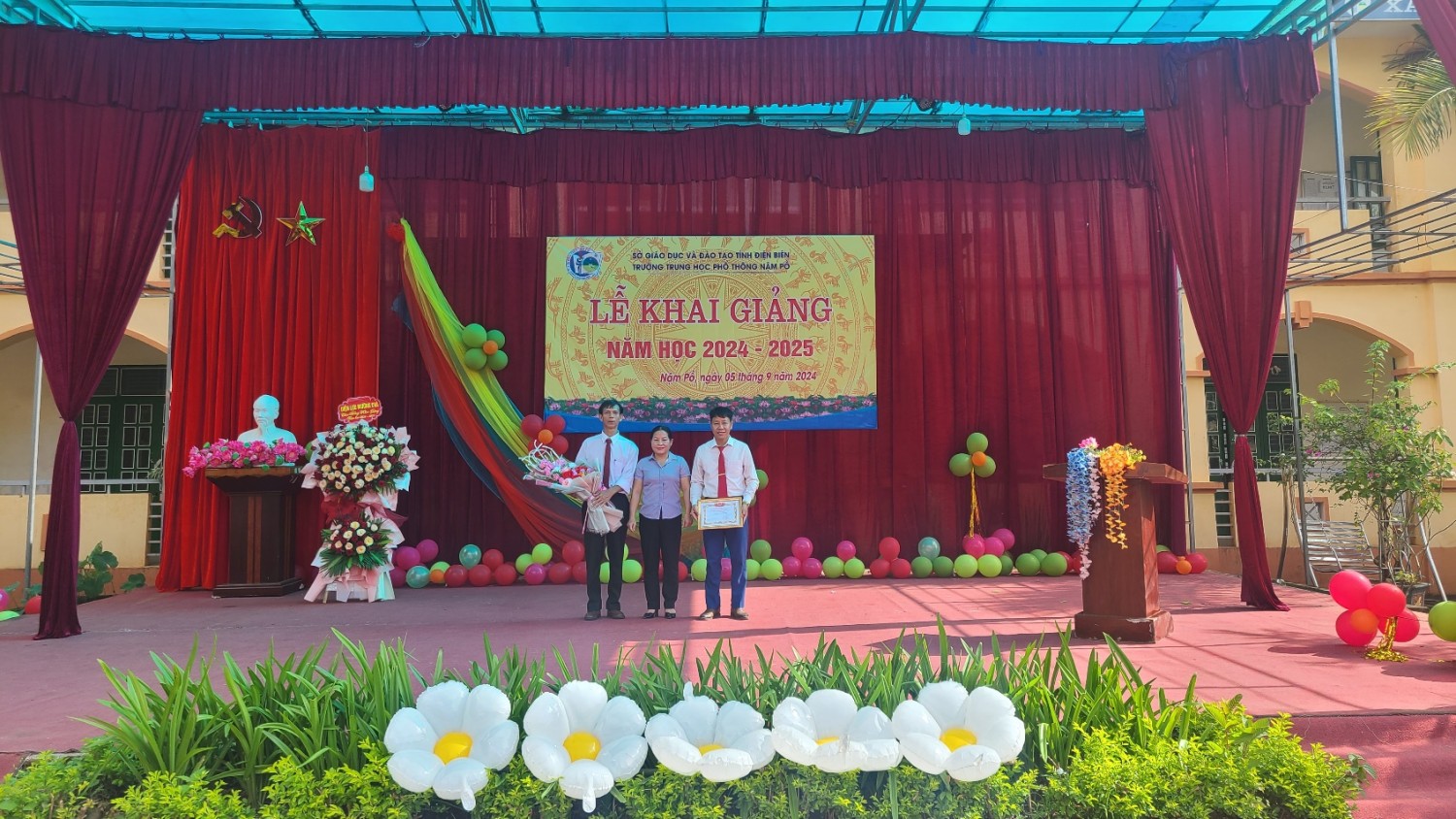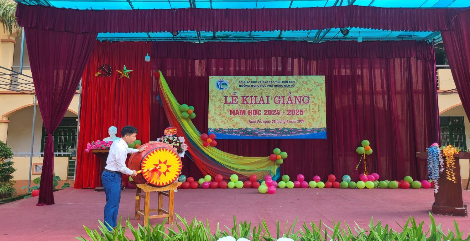 Thầy giáo Trần Trường Thiện - Bí thư Chi bộ, Hiệu trưởng nhà trường đánh trống khai trường trong Lễ khai giảng năm học 2024 – 2025 Trong năm học 2023-2024 nhà trường vinh dự được UBND tỉnh Điện Biên công nhận đạt danh hiệu Tập thể lao động xuất sắc; 05 cá nhân đạt danh hiệu CSTĐCS; 02 cá nhân được Giám đốc Sở GD&ĐT tặng Giấy khen; Tập thể nhà trường và 03 cá nhân cũng vinh dự được UBND huyện Nậm Pồ tặng giấy khen. Buổi Lễ khai giảng kết thúc nhưng trong lòng mỗi học trò và thầy giáo, cô giáo hồi trống khai giảng năm học mới giòn giã, ngân vang vẫn còn mãi thôi thúc thầy trò trường THPT Nậm Pồ với lòng quyết tâm cao, luôn cố gắng hoàn thành xuất sắc nhiệm vụ năm học, khẳng định vị thế và viết tiếp những truyền thống tốt đẹp của nhà trường./. MỘT SỐ HÌNH ẢNH TRONG BUỔI LỄ KHAI GIẢNG